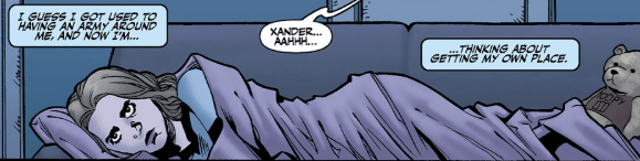 Buffy is on her couch. She can hear Xander and Dawn in their bedroom. It’s enough to get Buffy thinking about her own place. Like, really soon. She grabs her supplies, grabs a coat and yells that she’s going patrolling. In their bedroom, Dawn is giggling at her pretence, a confused Xander looking at her strangely. Dawn is smiling though: she got Buffy to go out at least.