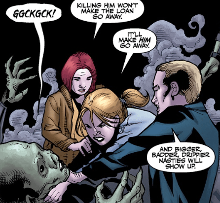 In another alley, the wraith has just demanded a repayment of Buffy‘s student loan. She looks at the piece of paper he presents to her: those are a lot of zeroes, Buffy says aloud. She asks the wraith what happens if she doesn’t pay up and he tells her that she will then learn the horrors of bad credit. Having enough of the ridiculousness, Buffy launches at the wraith, putting her hands around his neck. Willow and Spike hold her back and her best friend tells her that although killing the creature may be fun, it won’t make the loan go away. Buffy says she’ll make him go away, but Spike tells her that then even bigger and nastier debt collectors will turn up. He sounds like he speaks from experience.
