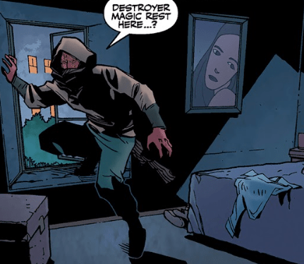 In the apartment Buffy shares with roommates Anaheed and Tumble, a silent, hooded figure creeps in through Buffy’s bedroom window. He notices that the smell he’s been following, that of the destroyer of magic, is not here, but he does note that she is a Vampire Slayer. His snooping around Buffy’s room alerts a snacking Tumble to his disturbance, but, by the time Tumble opens Buffy’s room, he finds the window open and nobody inside. The demon, clutching his semi-circular blades, will continue his search elsewhere.