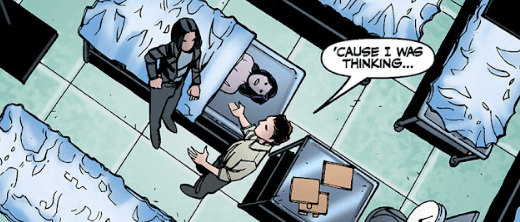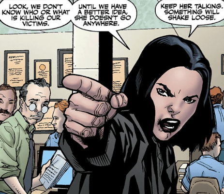 As she rushes away from the police headquarters, Buffy considers whether she should have waited and explained more. By the time she gets to Dawn and Xander‘s apartment, she’s on the TV, a wanted fugitive, escaped from the police! Worse, the police have named her as a murder suspect! The pair don’t doubt Buffy’s innocence and immediately ask her if she has any leads on who’s actually responsible for the deaths. She doesn’t know, she tells them, switching off the news report. But if she’s going to clear her name, she’s going to have to do some digging. She asks if she can sleep on their couch, but Dawn tells her it’s been taken. When Buffy sees stuff laid out on the couch, she just assumed it was for her. It seems the pair have had a private falling out, and Xander is on the couch.
