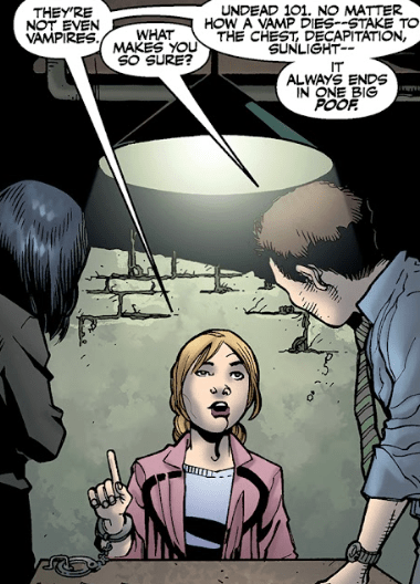 Buffy points out that that’s a dumb theory since these corpses aren’t vampires. They didn’t go poof, she says. Dowling asks if that always happens, to which Buffy replies with a nod. She asks if she needs a lawyer.