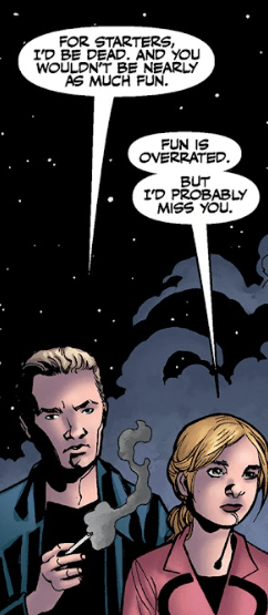 A few hours later, a very cranky Buffy is still awake, watching the city from above. She’s been trying to stay on the down low, but a voice and cigarette smoke alerts her to Spike behind her. He tells her that she’s a hard one to track down, but Buffy tells him that that was kind of the point.