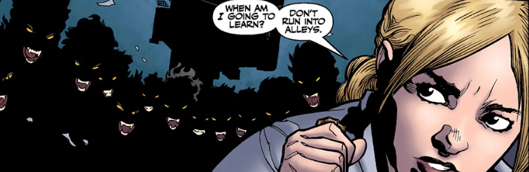Buffy hits the vampire, telling the man that they’ll talk when he learns to bring a stake to a vampire fight. The vampire runs and Buffy pursues, running away from the man and chasing the demon into another alleyway. Too late, she realises she’s been duped: the shadows inside the alleyway are bursting with vampires, hiding, snarling, ready to pounce. Buffy curses her rookie mistake.