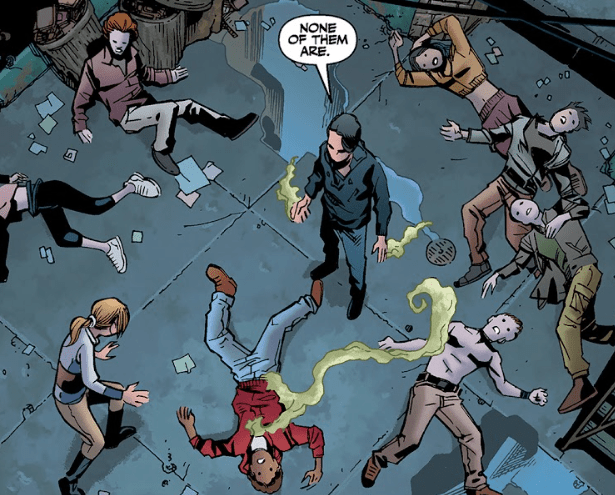 As Buffy continues her evening, no matter what she does, she keeps coming across vampires. Apparently the only thing I’m good at finding are vampires. Because I’m Buffy. Followed by the words ‘Slayer,’ ‘chosen’ and ‘one’. After killing her latest vampire, she’s surprised to find the same young man from earlier, the one she already saved. “You again?” Another vampire comes up behind her and the young man tells her that he can help: “I’m a Slayer. Like you.”