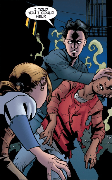 The vampire takes her unawares and bares his fangs extremely close to Buffy’s throat. Suddenly, the demon stops. His face starts to sizzle? His vampire features almost melt back into his head as the sizzling stops, the young man behind him. His eyes are glowing with the same energy coming from his hands. He looks down at Buffy and tells her that he told her he could help.