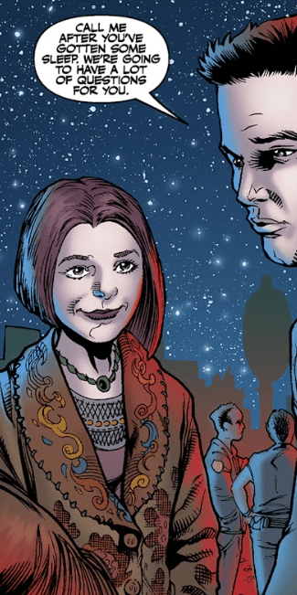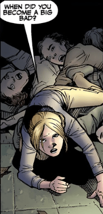 Dowling asks Buffy if she wants a ride home, but Willow stands behind him, smile on her face. “I got this,” she insists. Dowling nods and asks Buffy to call him when she’s rested and ready: he has lots of questions for her. As he walks away, Buffy asks Willow what she’s doing there and Willow tells her that Spike text a group alert about Severin the Siphon. She wanted to be here to be a shoulder to cry on, just in case she lost her powers. Buffy tells her that she’s still a Slayer. She wonders if that means her lift home is rescinded.