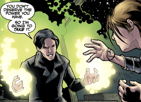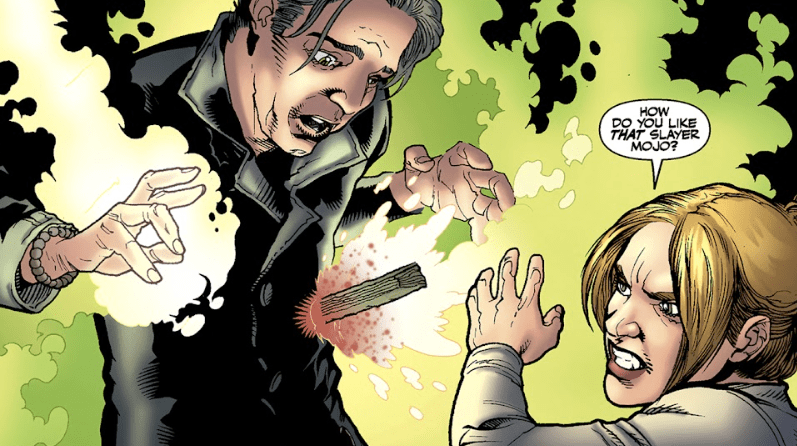 He looks down, clearly in shock, green energy still buzzing all around him. Buffy has stabbed her stake straight into Severin’s side. “How do you like that Slayer mojo?” Buffy asks him with anger.