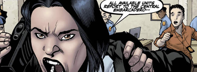 Around San Francisco, residents are watching the live news coming from the docklands. The news presenter details that the law have surrounded the fugitive, a Buffy Summers. Xander, watching from his couch, sighs. “What a refreshing change of pace. Buffy didn’t take our advice and try to work it out with the police.” Dawn starts to call Willow, as Xander begins counting how much bail money they’re going to need.