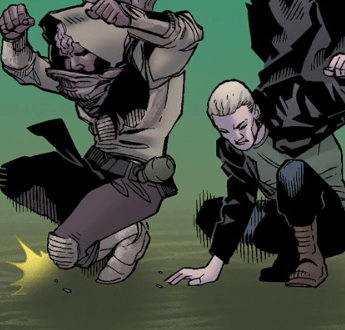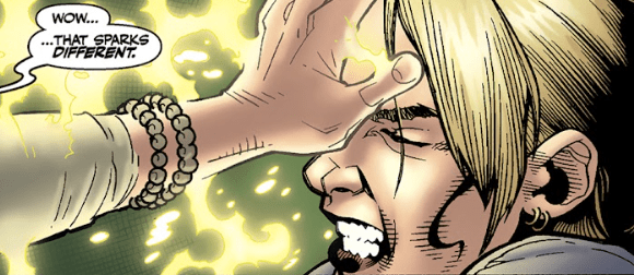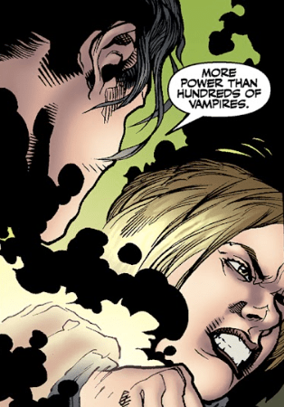 Underneath, Severin uses his growing strength to throw Buffy through a wooden beam holding the dock up. Severin finally makes contact with Buffy’s forehead, the energy working it’s way through his skin and into her system. He continues to drain Buffy, reeling in the ecstasy he’s feeling, paying no attention to Spike and Koh as they drop from the floor above. He easily swats the pair of them aside with an energy blast, not even taking his hands from Buffy, now grabbing her by the throat. He grabs hold of Spike as he strikes, beginning the draining process on the vampire as well.