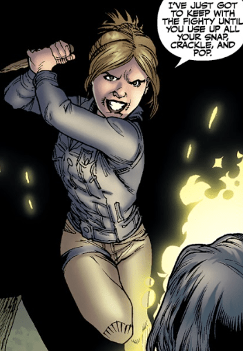 Severin, after he takes a moment to get over his initial shock, pulls the stake from his stomach and laughs at her. “You think a toothpick will stop me?” Buffy launches herself at him before he can fully prepare for an attack. She figures that he can’t use his powers unless he’s fully charged up with energy: she intends to hit him until his powers go snap, crackle and pop.
