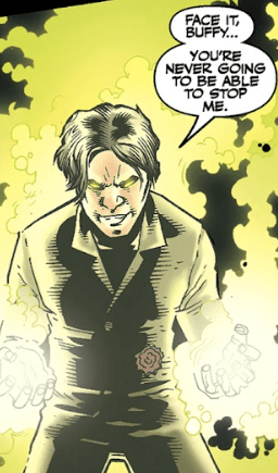 He smiles, lowering them closer to Buffy, delighted in the idea of the power of a Vampire Slayer. As he’s about to make contact however, he realises that something’s different. He feels a stinging in his side, an unusual feeling that’s new to him.