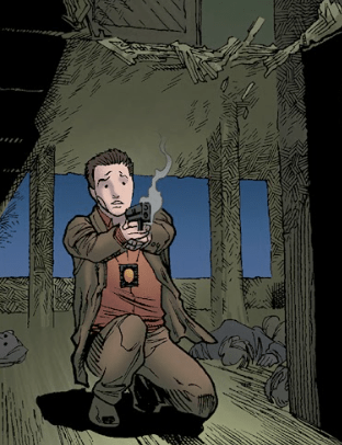 The gunshots echo for a while after they hit their target, the hollow warehouse going silent straight after. Severin looks down at the four bullet wounds in his chest and glances up, looking at Dowling, who’s still in position, his gun smoking. Buffy, gathering her strength back, looks down at Severin, his energy leaking from his wounds like water through a sieve. Reaching down to help Spike, Buffy sarcastically wishes Severin luck in healing his wounds.
