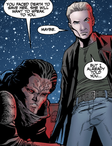 Koh turns to Spike and asks him why he, as a creature of the night, cares so much for the Slayer. Spike tells him that he and Buffy go way back. The demon looks at Spike, a glint in his eye: so you know each other? Spike doesn’t think that’s any of his business, but Koh tells him he was simply curious; in his culture, mating with humans is not permitted. Spike tells him that, despite what he may think, he’s not about to tell the whole long-story because they don’t have time. It’s not a drama. They’re friends. That is it.