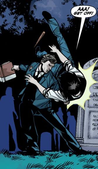 He trips his pursuer as he jumps over a gravestone, smacking him into the stone with help from his heavy volumes. “One. Telling the undead to die is an oxymoron. Two. I’m very much alive, no thanks to your idiocy. And three. Pay bloody attention to the task, Phillip!”