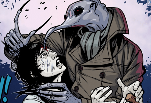 As the hat falls and the trench coat opens, the demon is revealed. It has the appearance of a humanoid mosquito – flailing nose-like appendage, big black eyes. His fingertips are longer than knitting needles. The appendage on his face strikes at Phillip, straight through his head.