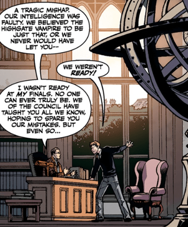 Later that night, Giles is confronting his father about the incident. He thinks his father is a murderer, claiming that they were sent in blind, as if “they were covered in raw meat and led into the lion’s den!” Giles’ father barely looks up from the volume he’s reading to listen to Rupert, never mind answer him. “A tragic mishap,” he tells his son, which only happened due to faulty intelligence. They believed the so-called ‘Highgate’ vampire to be a fabrication. If they had known that some creature was in the cemetery, they simply wouldn’t have been there. This does nothing to placate the angry teenage Giles though, who yells that his classmates weren’t ready for the test!