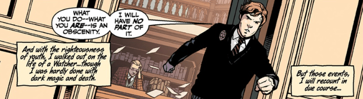 Giles father stops him. “A poor choice of words. The supernatural is our heritage, our destiny. We cannot escape it, so we must be prepared to meet it.” Giles continues yelling, despite his father’s cool temperament. “To Hell with destiny and to Hell with you! I am making a choice now father, for the first time in my life. What you do, what you are, is an obscenity and I will have no part of it!” With that, the younger Giles slammed his way out of his father’s office, with no intention of looking back. He would dabble in magic over the years, but for all intents and purposes, Rupert Giles, at 16 years old, walked away from his father and the Watchers.