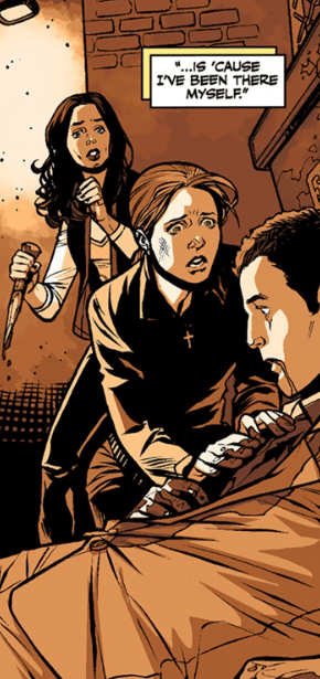 In the present day, a young woman is on the floor, surprised that the vampire she was making out with has bitten her, without her permission. Faith looks over her wounds whilst Nadira and another Slayer, Daphne, take out the vampire. As Nadira prepares to plunge her stake into his chest, Faith grabs her arm to stop her.