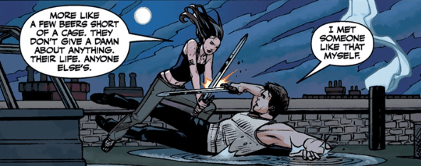 On the rooftop of her apartment, Angel and Faith are sparring, reflecting on their different encounters that night: Angel doesn’t want to bother Mother Superior, whoever she is, if she’s not doing anything wrong. Faith says he doesn’t want to deal with it, as she blocks a move from his blade with her own.