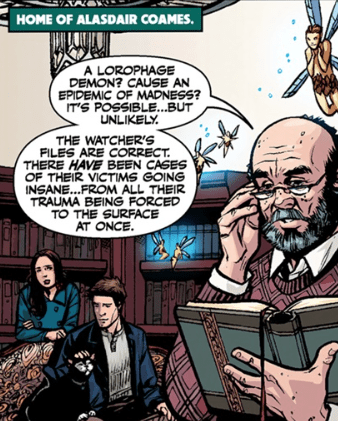 At the home of Alasdair Coames, Giles’ former best friend and ex-mage, Angel and Faith sit as Coames reads from a volume about the Lorophage species. It could cause an epidemic of madness, he thinks, but it’s not very likely. He turns to Angel. “The Watcher Files are correct. There have been cases of their victims going insane, from all their trauma being forced to the surface at once.” But only if the attack is interrupted. Faith points out that Giles’ attack was interrupted and he didn’t go crazy or die.