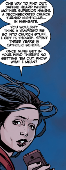 He nods. “Gourmet meals for a Lorophage demon.” What’s more, Faith adds, is their families all confirm prior contact with Mother Superior. Like they had joined some sort of cult. Her Slayers have a location for the mysterious woman as well: an old deconsecrated church, which has been turned into a nightclub. In Highgate, funnily enough. “You wouldn’t think a vampire’d be into church stuff. I get it though. Spent three years in Catholic school,” Faith tells Angel. “Once nuns get in your head there’s no getting them out, know what I mean?” Once she’s finished, Angel doesn’t say anything else. He simply tells her that it’s time for them to move.