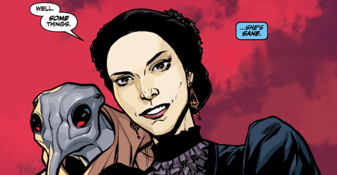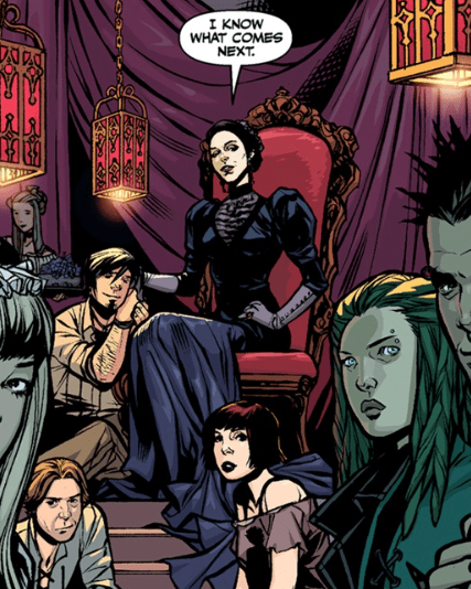 In the nightclub, Angel kicks through heavy oak doors to the back of the former vestry. The ancient doors are remarkably sturdy considering their age. He calls out to Mother Superior, telling her that it’s time to explain everything. He looks up at the room, where a group of followers are quietly worshipping Mother Superior, who sits atop a red velvet chair, a pedestal-like throne. Angel looks straight into Mother Superior’s eyes as she tells him that she knows what comes next.