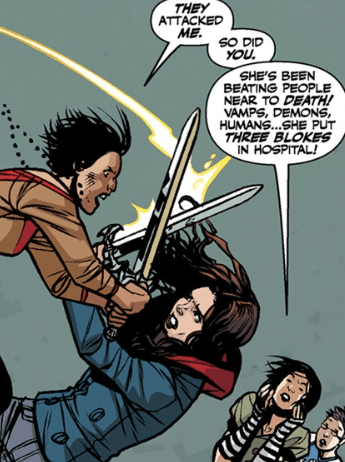Nadira has absolutely no hesitation in her movement as she parries her sword, thrusting it straight in Faith’s direction. Faith counters with her own blade. She blocks the blow easily, ducks down and slides through Nadira’s legs. “This is getting old,” the older Slayer says. “I know your squad died in front of you. I’m sorry. But pounding your friends isn’t gonna fix it.” Nadira tells her that her friends attacked her, but one of the Slayers points out that Nadira has been beating people, almost to death! “Vamps, demons, humans… she put three blokes in hospital! And they can’t even give her what she’s after! No one knows where to find Pearl and Nash.”