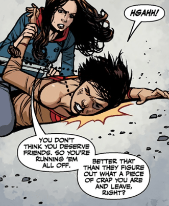 Faith twists Nadira until her arm is behind her and forces her to the ground. “You don’t think you deserve your friends, so you’re running them all off. Better that than they figure out what a piece of crap you are and leave, right?”