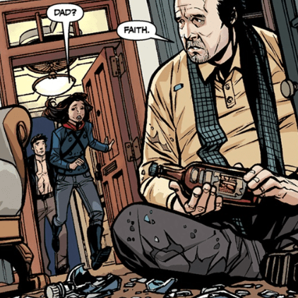 Faith grabs her father by the collar. “What did you do?” Her father looks at her, a slight grin in his face. “What I had to. To provide for you.” Faith once again tells him to get out.