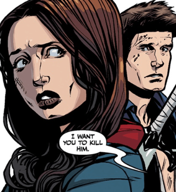 Before he can take his shot, Faith comes from above, slicing his arm, taking his hand off at the wrist, gun with it. As his hand falls away, Jimmy screams, more in shock than pain. Angel tells him to shut up and starts to control the bleeding. He starts to ask Faith for help, but she just stares at Jimmy, cradling his bloody stump. She drops her sword to the floor with a clang.