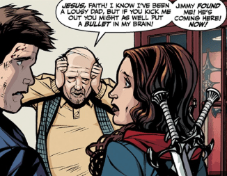 Angel puts his hands on her shoulder. He looks at her. Just one look. Faith lets go, the tears still falling and she steps away, leaving her father recovering, coughing and sputtering on the floor. Angel picks him up and opens the door, pushing Pat Lehane through it with a warning: “You ever contact her again… I’ll show you who I really am.”