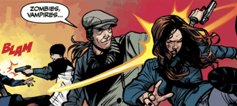 In response, Angel vamps out. “Or I could.” Jimmy instantly yells out, recognising a vampire and ordering his men to shoot Angel in the head. Angel disarms the gangsters, crushing their firearms with his bare hands. “That’s zombies,” he states. Jimmy doesn’t care. He pistol-whips Faith in the back of her head, as Angel is shot and goes down, large hole in his check. “Zombies, vampires,” Jimmy says, as he aims his gun at Angel, on the floor. “Blow off the head, problem solved.”