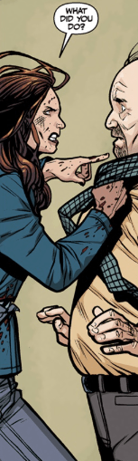 Pat looks at her, surprised for a moment. He then sneers at Faith, looking her square in the face. “Look at you. Got some money now. Living in England. And you think you’re friggin Princess Di. But I know where you came from. I know what you really are.” He grins and gestures down towards Faith’s hands, covered in Mulligan’s blood.