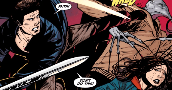 Angel storms into the former church, slamming himself into the Lorophage and managing to interrupt the treatment, the demon releasing it’s grip on Faith, it’s needle-like pins withdrawing from the Slayer’s forehead. He shouts at Faith, telling her not to have the treatment.