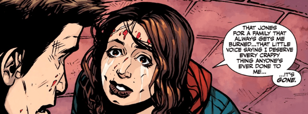 “I feel great,” she says, a big smile gradually forming on her lips. She presses her hands to her chest. She turns to Angel and her voice has a quiet tone, one that Angel has never quite heard before. It sounds like peace. There’s no anger. No pain. “I mean, I remember it all, my Dad, the Mayor, everything they did to me. But I don’t care.”