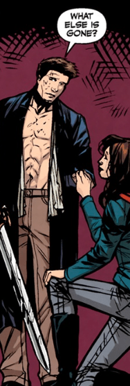 Angel, holding his shirt closed, admits that yes, he has a magical artifact in his nipple piercing. It’s called the Tooth of Ammut. “The ancient Egyptians believed there are nine parts of the soul. I’m not sure the number’s exactly right, but yeah, I’m collecting them all. I wasn’t sure what you’d think. I know you don’t believe I can bring him back.”