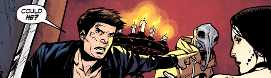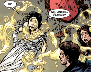 The followers behind them, vampire and human alike, are starting to clear from their trauma-free existence. All the pain and hurt returns to them. They’re horrified, instantly blaming Angel and Faith for their returned emotions. They surround the two, like an unruly mob, but Angel and Faith manage to stumble their way through the crowd without hurting them. When Angel gets to Drusilla, he tells her that she can call them off, and that he can still help her. She laughs. “There’s not enough help for you. Now I’m myself again, I’ve skipped ahead in the book. And oh, the awful pictures…” She stops, sudden sadness on her face. “It’s coming, you see. For the both of us.” She tells Angel that the pieces have come together in his heart, but they’re all “cutting each other, like shards of glass.” She tells him that ghosts from his past will soon come to visit again. Hers will too, she claims.