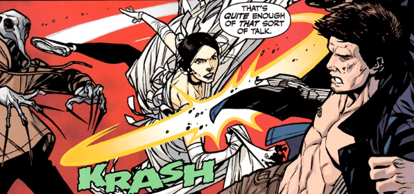 Just as she finishes speaking, she’s staggered by a boot to the back of the head. Faith moves into action, sword in her hands. She doesn’t say a word as the Lorophage takes his appendages from Angel’s head. Drusilla’s face turns to her demonic visage instantly, snarling at Faith, all hint of the calmness gone. “Ungrateful wretch,” she screams, as she tries to catch Faith with her long finger nails. “After all I’ve done for you!” Faith flips away from her towards Angel, who’s getting to his feet.