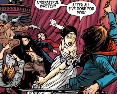 Without warning, she dives at Angel. “That’s quite enough of that sort of talk,” she snarls, easily evading Angel’s sword and arching herself backwards. She picks up a candelabra, swinging it around at her sire, his sword slicing the trail of her gown. “You want everyone to be like you. A shattered helpless thing!” She manages to disarm Angel, driving him towards her throne. Her nails scratch straight across Angel’s stomach, drawing blood. “I will never be that again! None of us will.”