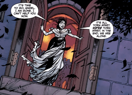 She opens the door to the church, still ranting, still raving. “It’s time to go, Angel. I am gone. I can’t help you now.” She runs out of the former church into the dark night. “It’s all torn apart. We’re all torn apart. In the end, we are alone.” And with that, Drusilla is gone once more.