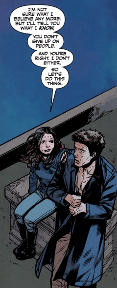 Faith sits down on the roof top’s edge next to him. “I’m not sure what I believe any more, but I’ll tell you what I know. You don’t give up on people. And you’re right. I don’t either. So let’s do this thing. I’m in.”