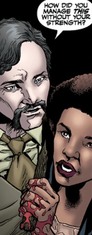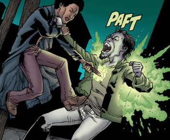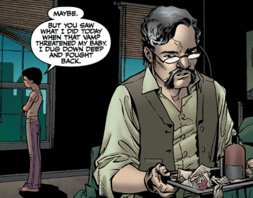 1973. Nikki is surrounded, by at least five vampires. She fights well, taking two out with her stakes fairly quickly. A third manages to get past and pins her, ready to feed, but he’s dusted by Crowley, who’s followed his charge. “Who says Slayers are the only ones good with a stake?” he says, slight swashbuckling grin on his face.