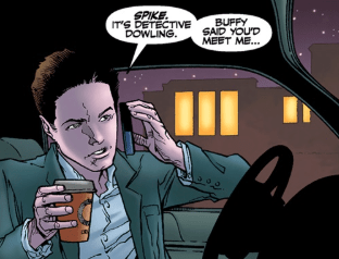 In downtown San Francisco, an impatient Detective Robert Dowling is in his car, coffee in hand. He’s on his cell phone, trying to leave a message. He’s clearly irritated slightly. “Spike, it’s Detective Dowling. Buffy said you’d meet me at the…”