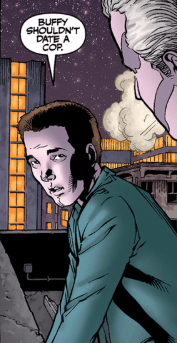 Dowling shakes his head slightly. Buffy shouldn’t date a cop, he thinks. “I see a lot of bad stuff. It’s hard not to bring that home.” Spike scoffs. After everything she’s been through, Buffy can handle police matters. She can handle anything: it’s Dowling he’d be worried about. He grins.