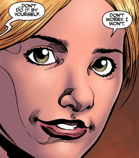 Dawn reassures her that they’ve all made mistakes: heck, if it wasn’t for alcohol, she herself wouldn’t have gone from giant to centaur to doll in the last few years! Dawn suggests a list of people she was alone with, people of the male persuasion, but Buffy’s answers don’t help at all: “Riley, who’s married. Andrew, whose name I’m not sure why I’m saying. Root, who doesn’t shower. Tumble, who showers infrequently. The shut-in neighbour who’s name I can’t remember. And then there’s Spike.”