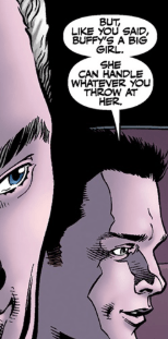 She says that she can handle the Slayer stuff, but everything else? That she’s not ready for. She looks at Spike, tears in her eyes. “It’s not the Slaying. It’s me.”