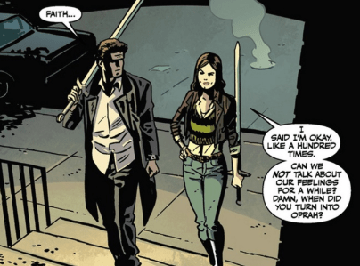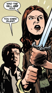 “Who the hell are you?” Faith asks them both, her anger raging, her temper rising. Angel looks at her wearily: it’s been a long night. In an effort to calm her tension, he steps in. “You knew Giles?”