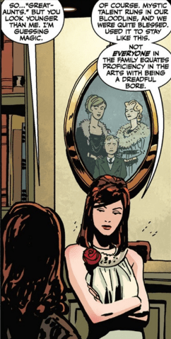 Faith guesses that the aunts must use magic, since they haven’t aged a day since the portrait and it was taken when Giles was a child. Lavinia folds her arms, slightly annoyed. “Of course. Mystic talent runs in our bloodline, and we were quite blessed. Used it to stay like this. Not everyone in the family equates proficiency in the arts with being a dreadful bore.”
