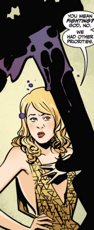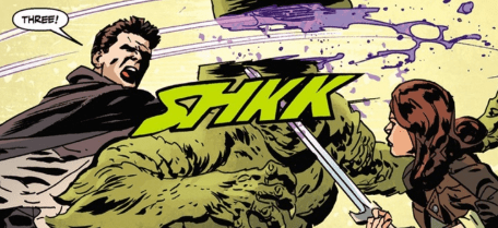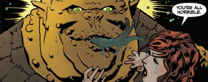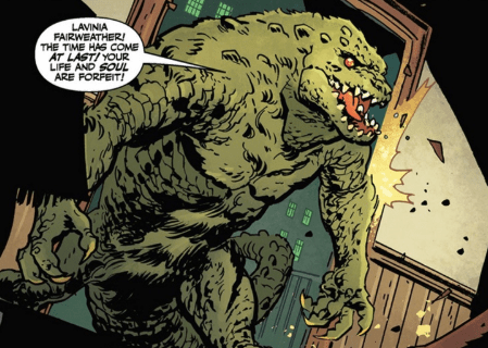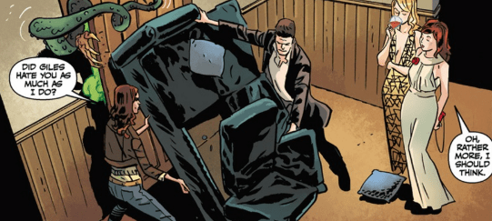 The creature starts to roar it’s demands. “Lavinia Fairweather! The time has come at last! Your life and soul are forfeit!” The creature doesn’t get far inside however, as Angel takes the remains of the door and slams them into the creature’s head. “You forgot to knock,” he quips. He is not expecting the lizard to roar at him and certainly wasn’t expecting the flash of flame that suddenly erupts from it’s mouth. Faith and Angel jump out of the way. As Faith plunges her blade through the lizard’s jaw, Angel yells at the sisters: “Little help here? I know magic’s gone, but with your power you must have some tricks up your sleeves?”