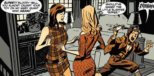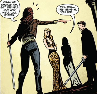The two partners prepare themselves and, within seconds, slam their way into Faith’s apartment, swords drawn and ready to swing. In the main reception area, they find two women, sitting down casually, drinking wine. “Oh hello,” one of them says. They’re both young attractive women, one blonde, the other brunette. The brunette, checking her freshly-painted nails, in a high-pitched and posh English accent, turns to them both. “You must be Rupert’s little friends.”